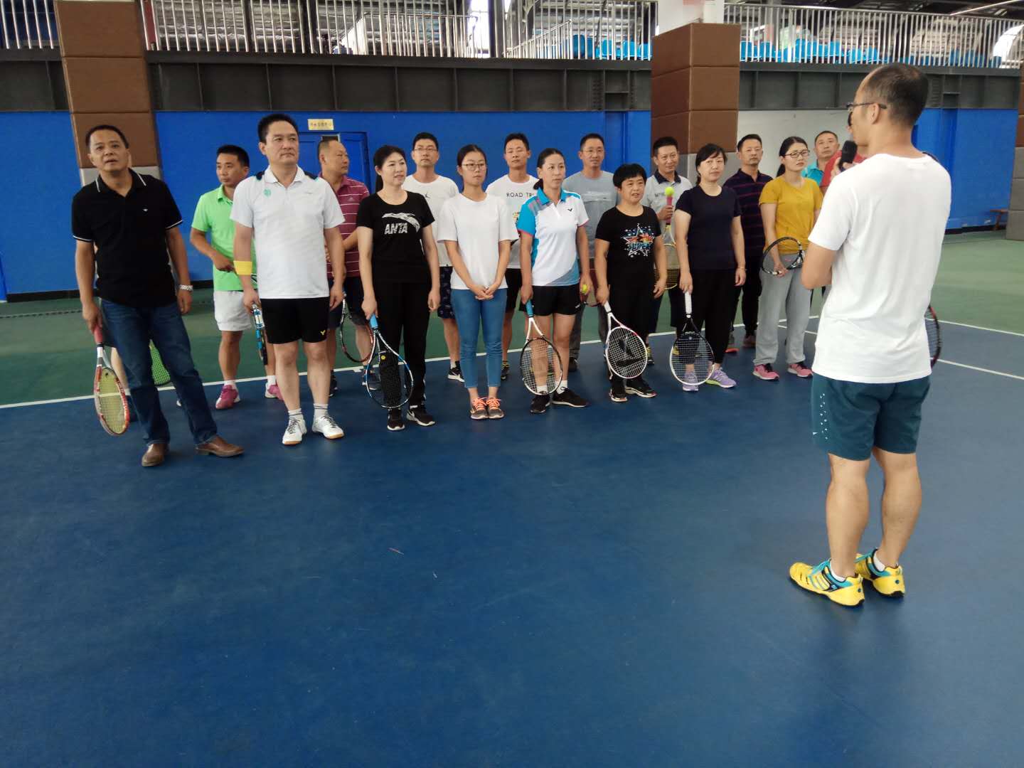 开学之际,由体育教学部小球教研组牵头开展了本次网球教研活动,活动按照正常上课步骤,由准备活动开始,在邵俊文老师动作示范讲解中拉开序幕。按照网球基础将参加教师分为入门组和提高组分别教学。训练结束后每个老师还进行了技术动作的展示,在展示中不断的体会、纠正、完善自己的动作。